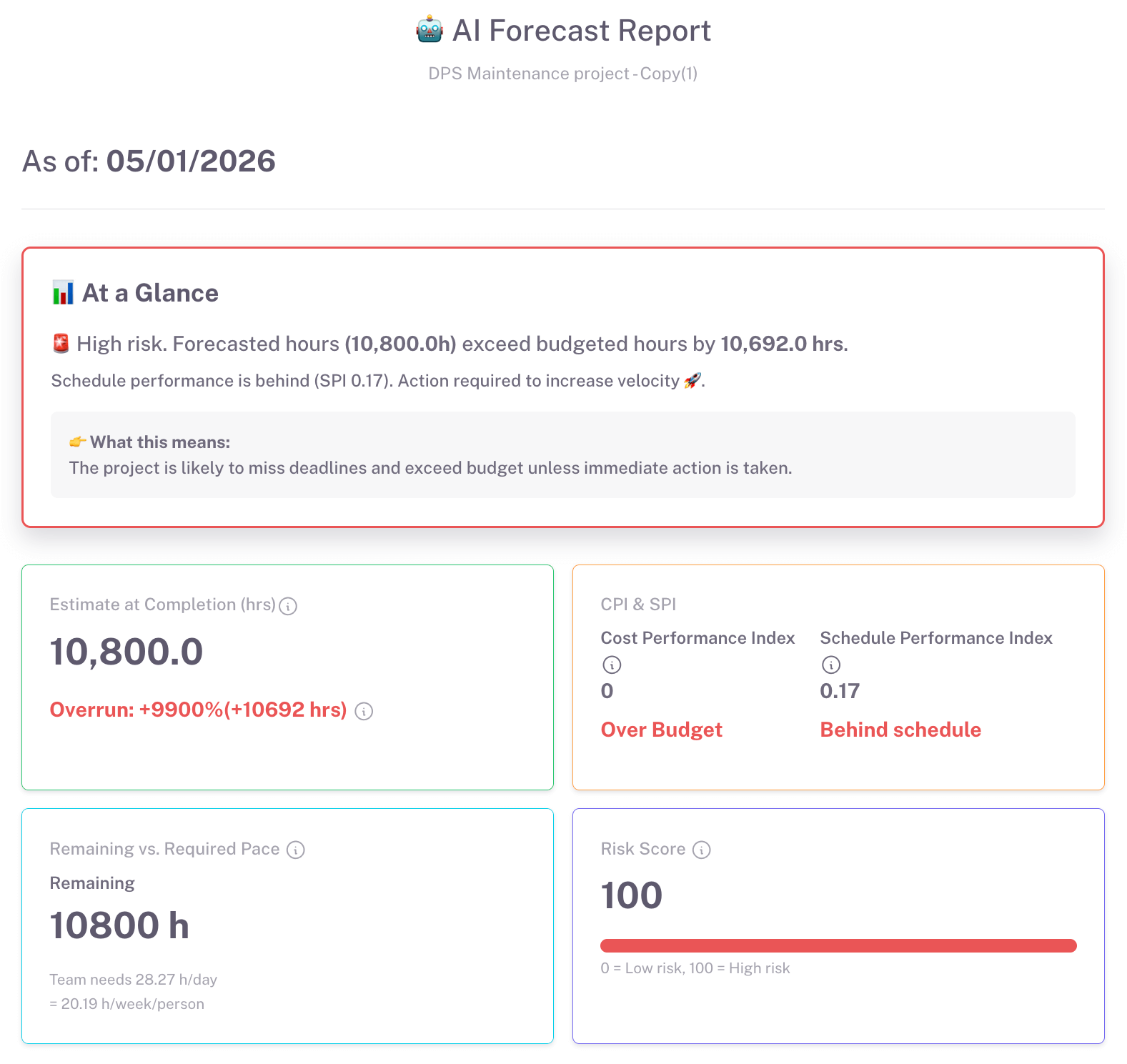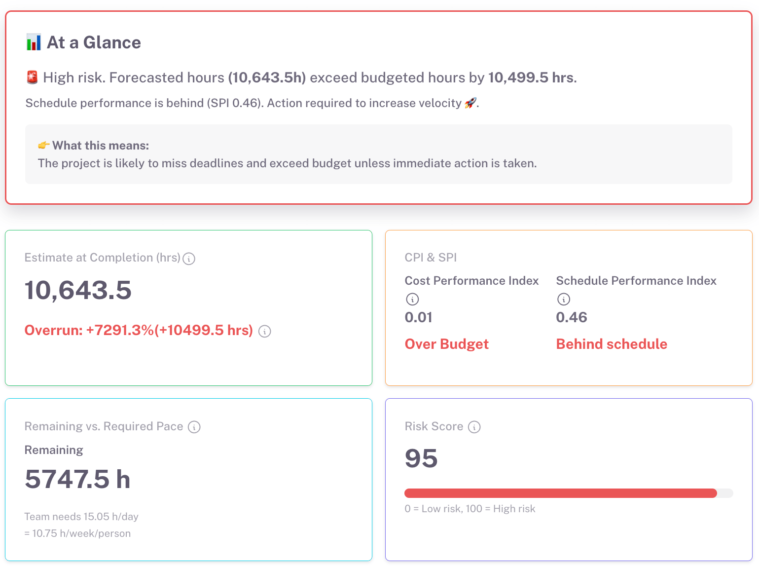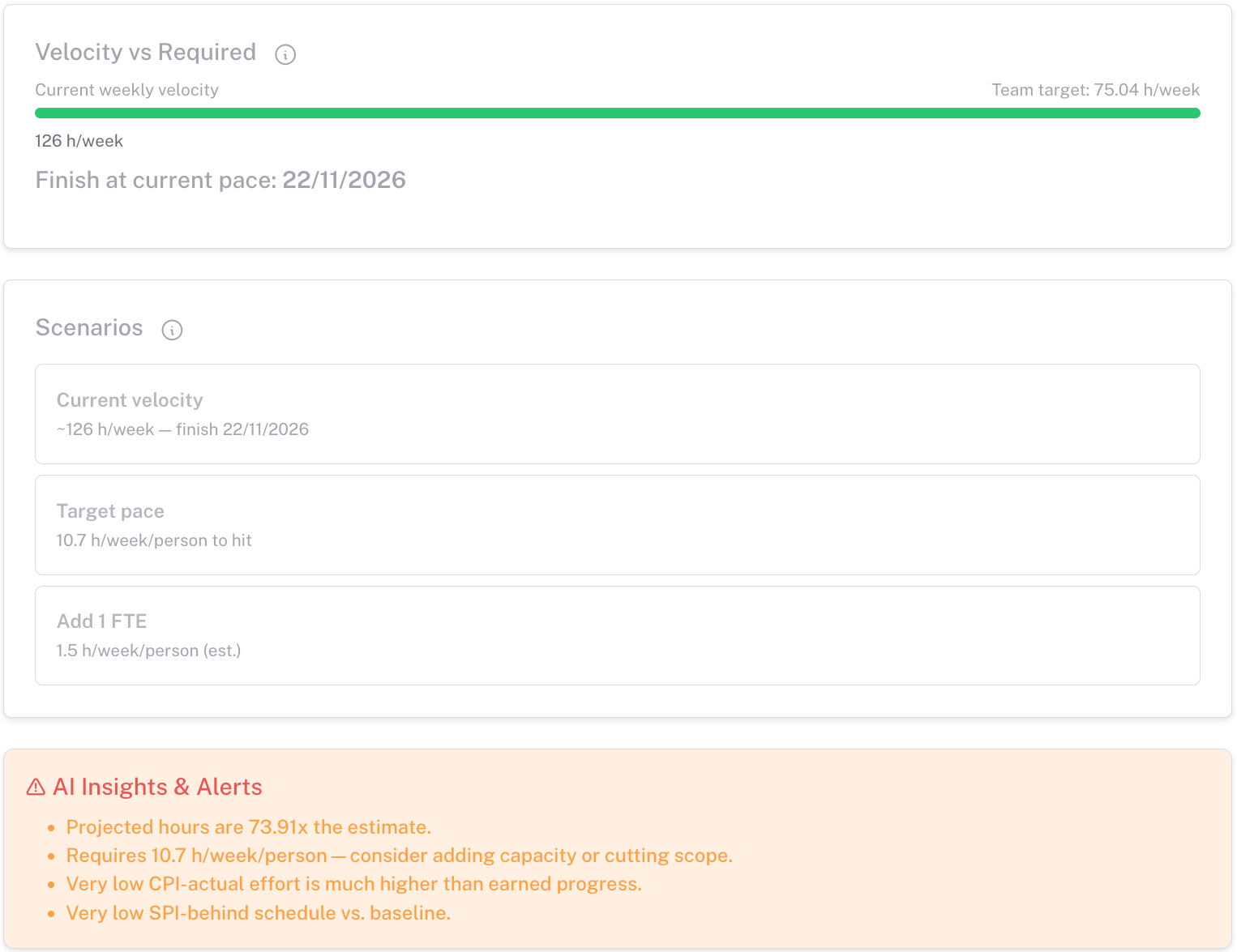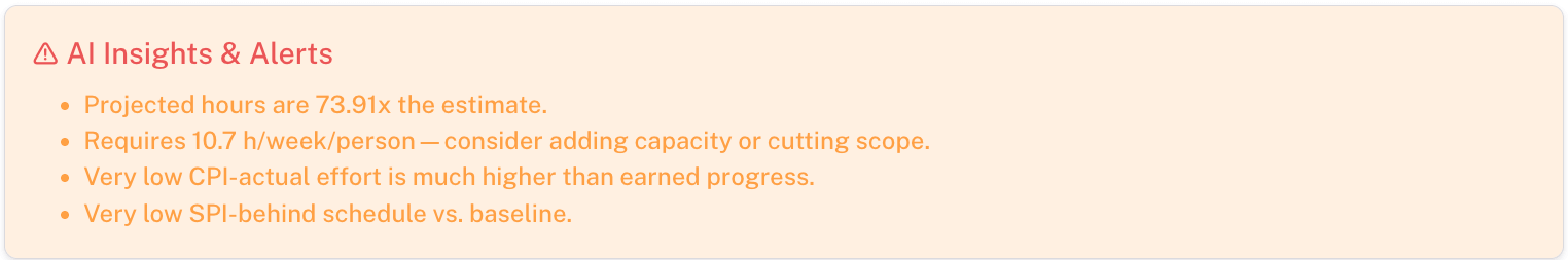 - Effort Forecasting: AI calculates how many hours your project will need based on progress, pace, and historical data.