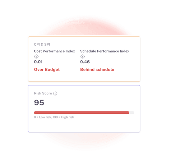 Identify scope of slips, budget overruns, or schedule delays before they impact delivery. AI assigns a clear Risk Score and highlights the areas that need immediate attention, helping you take proactive action instead of firefighting.