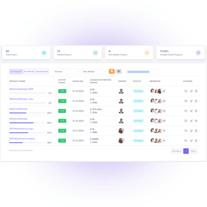 - Real-Time Tracking: Monitor progress against estimated hours, MTD/YTD data, and completion rates.